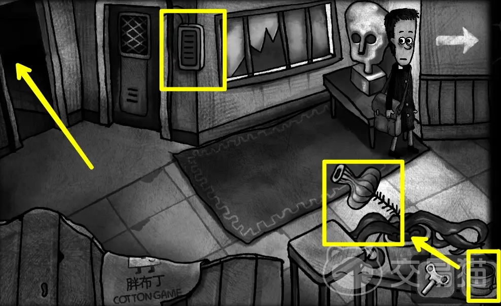 开了门之先别急着进去,先给花浇一下水,会接取到一桶墨汁,同时右边桌子上的药丸也不要忘了拾取,然后进门打开燃气灶,拾取铁锹和桌子上的药,再回到初始地图上楼,这部分的解谜就暂时告一段落了。