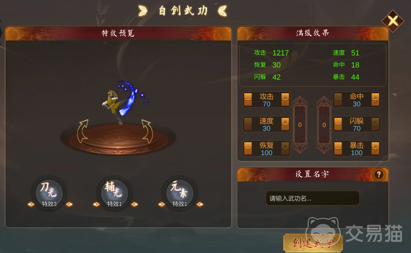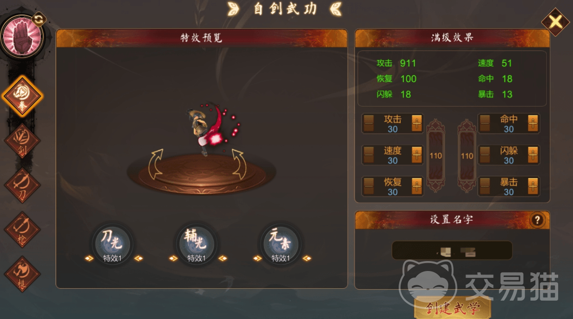 大家可以根据需求自由分配,并查看武功满级后的属性,分配完属性后第三步就是武功特效,特效大致有三种,分别是元素类、刀光类和辅光类,每一种不同还分别有10中颜色和5种形状,让玩家来自定义。