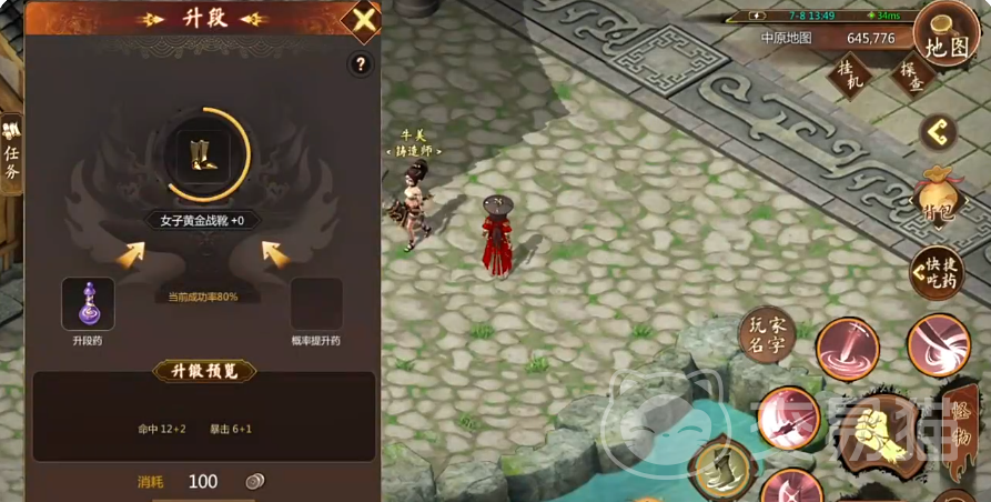 首先建议大家进入中原地图,在这里可以拿到比较丰厚的一笔钱,也就是9百万的铜币,拿到这些钱币后,可以去商店当中,购买330的金元,之后就去寻找锻造石,也就是NPC牛妹,她会帮助大家讲背包中传家的戒指升级为侠客戒指,这样角色的属性就得到了大幅度的增强,这样后续挑战副本也更加有底气。