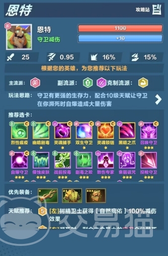 大地树精也是新手玩家的优质选择之一,这一英雄的操作难度同样不高,新手玩家可以毫无顾忌地优先选取守卫技能,凭借其强大的被动减伤能力,想要取得前四的名次更是轻而易举的,大地树精的独特之处在于其被动减伤效果不错,在战斗过程中经常会出现对面敌人对其发起攻击,然而无论是守卫技能还是大树自身的被动减伤,都能让其所受伤害大幅降低,甚至有时会出现看似激烈的攻击却并未对其造成实质性血量减少的情况,在游戏前期特别是在第1、2回合时,如果未能顺利拿到守卫技能,千万不要吝啬金钱,果断刷新技能列表去找,因为前期大地树精若没有守卫技能加持,很容易陷入连败的困境。