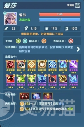 而15级的时候,天赋赋予她每添加150层寒霜就能眩晕目标 0.2秒的能力,这在控制敌人方面起到了关键的作用,然而冰霜女王在游戏前期,尤其是在10级右天赋点出来之前,其实强度相对有限,她的强势期是在10级以后,当拿到自然之力和暗影脉冲等关键卡牌后,才开始真正发力,所以在抓卡的策略上,玩家需要优先将回复相关的卡牌升到10级,在10级之前可以相对随意地拿卡,但要时刻留意并去抢回复紫卡。