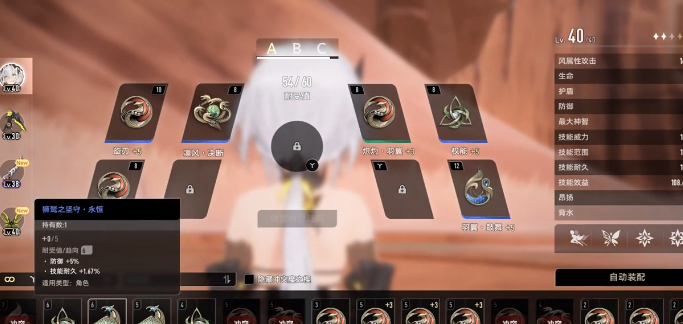 品质也会分成绿色、蓝色、紫色还有金色,品质越高,则意味着属性就越强。升级就可以解锁更多的词条属性,例如增加技能耐久、提升威力,还有降低能耗。系统支持自动装配,但是建议选择手工装备,可以针对角色的技能去定制效果。例如赛琪主要是选择技能耐久,还有最大神智魔之楔,如此就可以有效实现永续飞行,带来较好的效果。