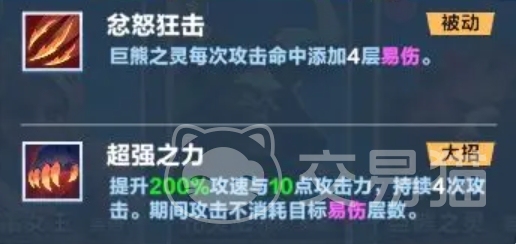 巨熊之灵的被动技能为攻击时附加易伤效果,这一特性表明它与易伤和普攻流派存在着一定的契合度,大招能够提升攻击速度,并且在大招持续期间,攻击目标时不会消耗已有的易伤层数,这也再次强化了它与易伤和普攻流派的适配性,在 5级天赋的选择上,左侧天赋赋予被动技能附带 1%最大生命值的物理伤害,这意味着英雄的生命值越高,所能造成的伤害也就越高,所以生命流派也成为巨熊之灵的一个可行发展方向。