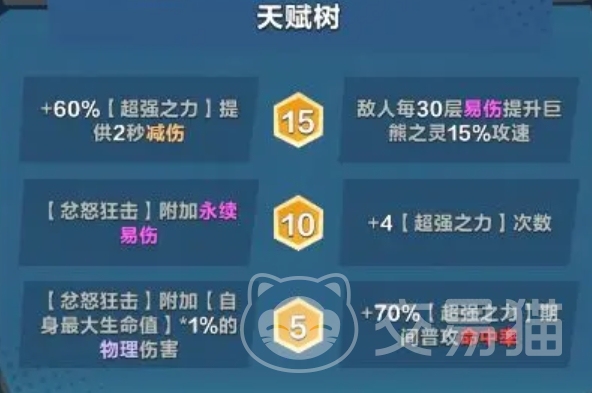 再看15级天赋的选择,右侧天赋能够增加攻速,这一特性一目了然地表明其适合走普攻易伤流的玩家,而且最好能与10级左天赋配合使用,左侧天赋则使得巨熊之灵在释放大招后的 2秒内拥有高额减伤效果,这一特性非常适合走无限大的玩家,通过不断释放大招来持续获得减伤效果,从而有效地降低对面输出,还有实战普攻易伤流也是比较受大家推荐的一种玩法。