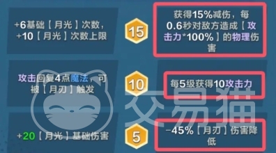 而10级的时候选择右边每5级获得10攻击力,后面15的时候选择获得15%减伤,每0.6秒对敌方造成攻击力100%的物理伤害,月神骑士作为一名典型的普攻英雄,在游戏前期有着独特的发展路径,她可以通过提升普攻等级来迅速积累优势,从而打出连胜的开局,但是如果外面强势连胜英雄过多,那可千万别硬拼,这时候不妨巧妙地蹲到10级,再去寻找合适的时机转连胜。