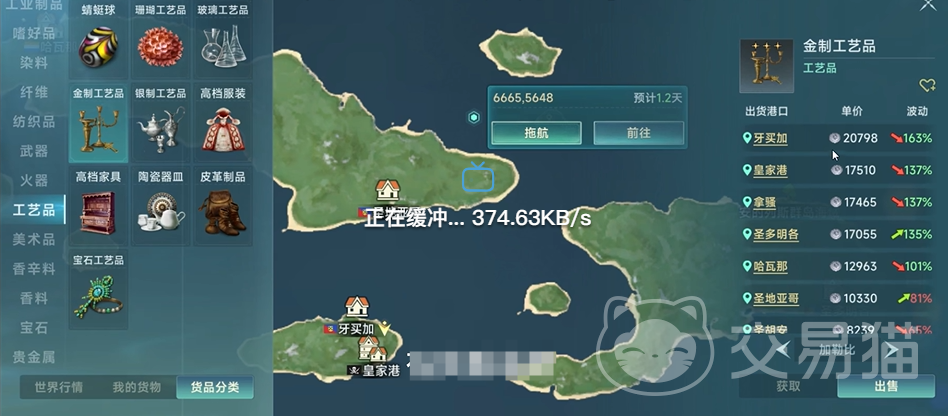 还要提醒大家的就是,工艺等级的提升并非一蹴而就,工艺品的制作会跟着等级的提高提升难度。为了更高效地提升,建议使用一些能临时增强工艺能力的道具,这将有助于挑战更高难度的制作项目。也可以使用缩短制作时间的辅助物品,来提升制作速度,从而更快获得经验,加速升级进程。满足所需要等级之后,就可以去准备制作所需的材料。金制工艺品需要两个砂金和两个模板。有的伙伴们需要一次多制作一些,那就可以多准备一些原材料。砂金可以在牙买加和圣地亚哥这两个港口城市购买到,其中圣地亚哥还可以购入木板用于其他金工制作。由于这两座城市地理位置接近,大家可以一次航行前往,集中采购全部的物资。