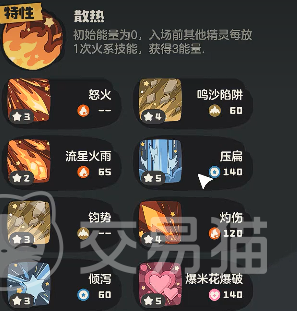 谈起这精灵技能的搭配,这技能还是老样子需要携带四个,那么来看这四个技能,这其中第一个技能是一个纯伤害类型的技能,该技能叫做火云车,这技能在释放以后可以对敌方精灵造成高额物理伤害。