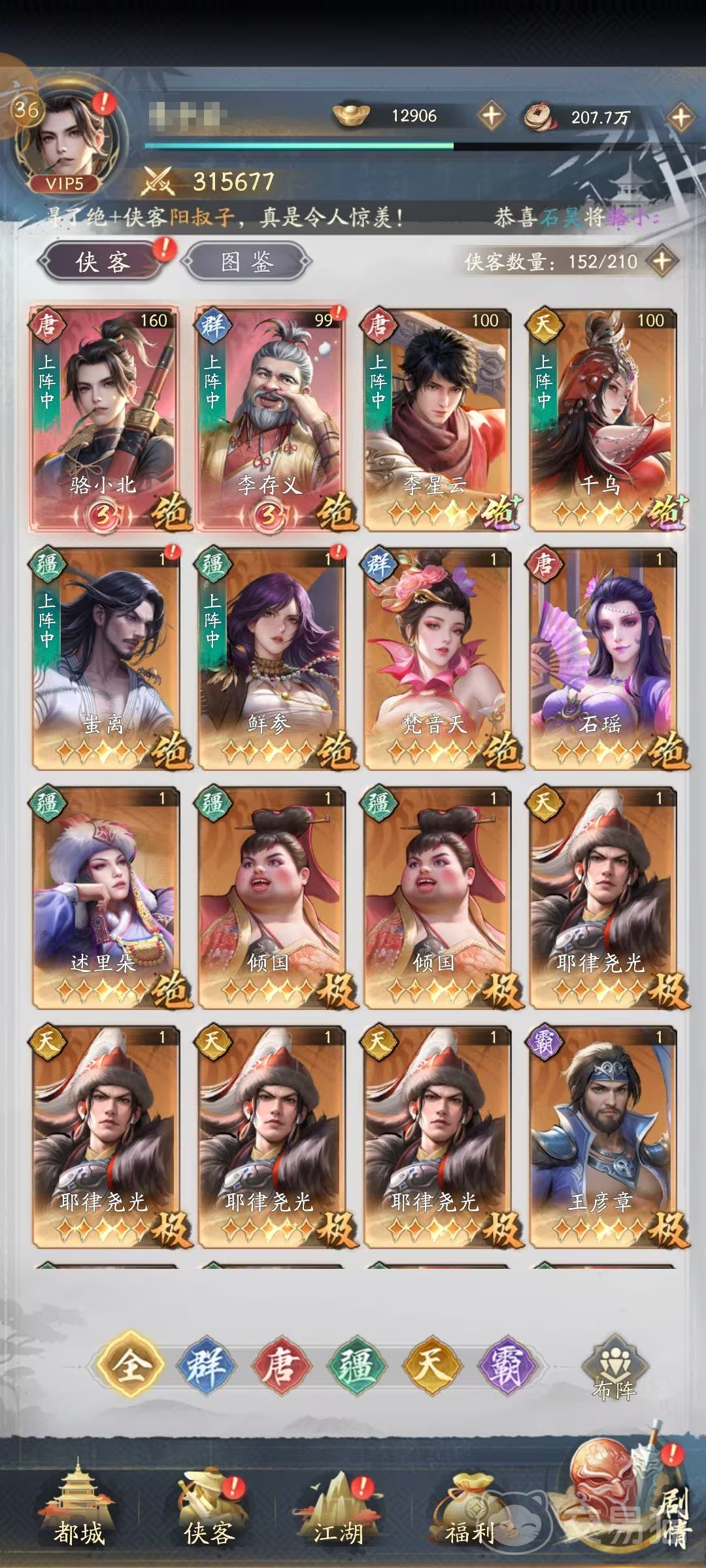 前期的资源不够充裕,因此在角色培养方面也需要慎重,可以优先选择培养度更高的一些角色。优先选择1-2个核心输出来培养,李星云和女帝就比较推荐,前期推图的帮助作用很大,李星云能给到护盾以及怒气回复效果,群体输出能力优秀,女帝具备单体秒杀能力,如果能抽到袁天罡,也可培养,他具备很强的全屏爆发能力。初期时不要分散养太多的侠客,将资源倾斜给主C,之后可以考虑副C以及辅助。