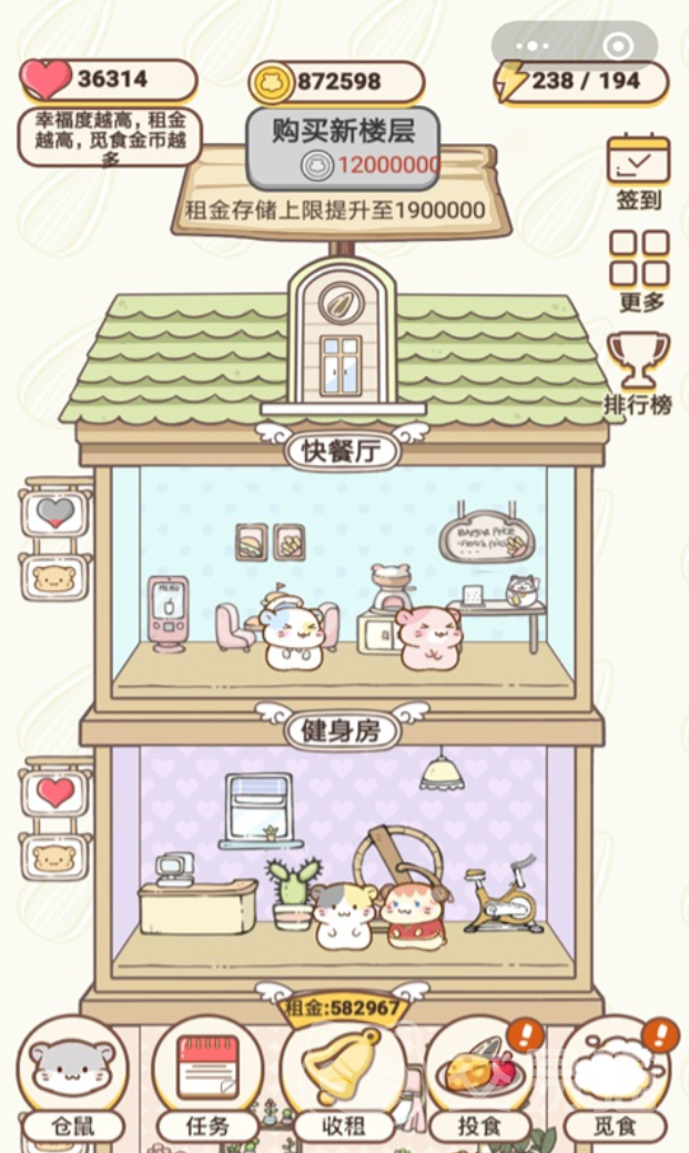 小伙伴们将会在游戏内获得一栋公寓,而小仓鼠们将会与你一起幸福的生活在这栋公寓中。你需要精心的照顾这些小仓鼠才能够让他们茁壮成长,无论是喂食还是洗澡都需要关注到。小仓鼠们将会为你带回金钱和公寓升级所需要消耗的物资,当这些都积累足够之后,玩家们就可以升级公寓,以获得更多的装饰物,并且对公寓进行改造。