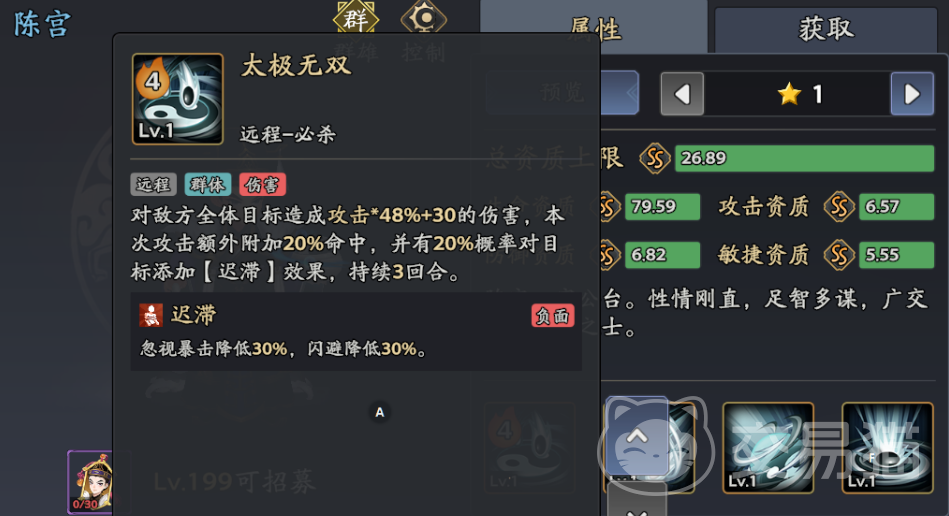 效果:全体48%攻击+30伤害,20%概率挂【迟滞】(持续3回合),附加20%命中提升。