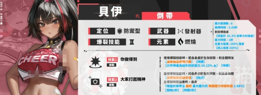不仅如此,贝伊的第二技能“大家打起精神”同样为她的防御体系加分。在技能激活时,贝伊可以分摊掩体所受到的伤害,并且在爆裂结束后,还会给予自己持续的恢复效果。掩体每秒恢复最大体力的1.58%,这个恢复效果持续5秒。贝伊不仅能够在面对敌人猛攻时存活下来,还能借助这个恢复机制迅速恢复,继续为队友提供支援。她的生存能力无疑比其他防御型角色要更加稳固。