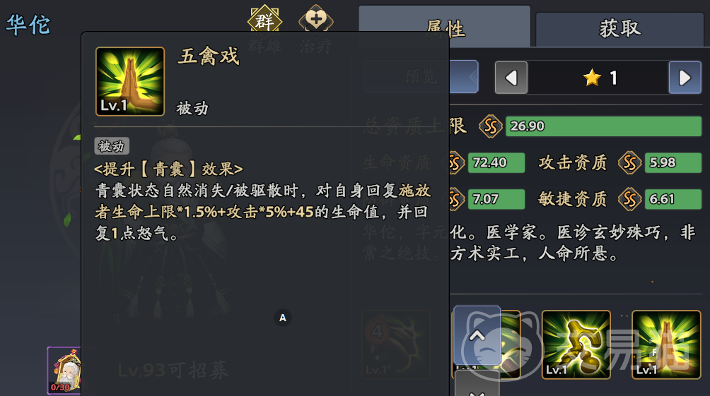 加点优先级:1.五禽戏(被动2)→2.救世良方(大招)→3.刮骨疗毒(主动技)→4.世之医圣(被动1)
