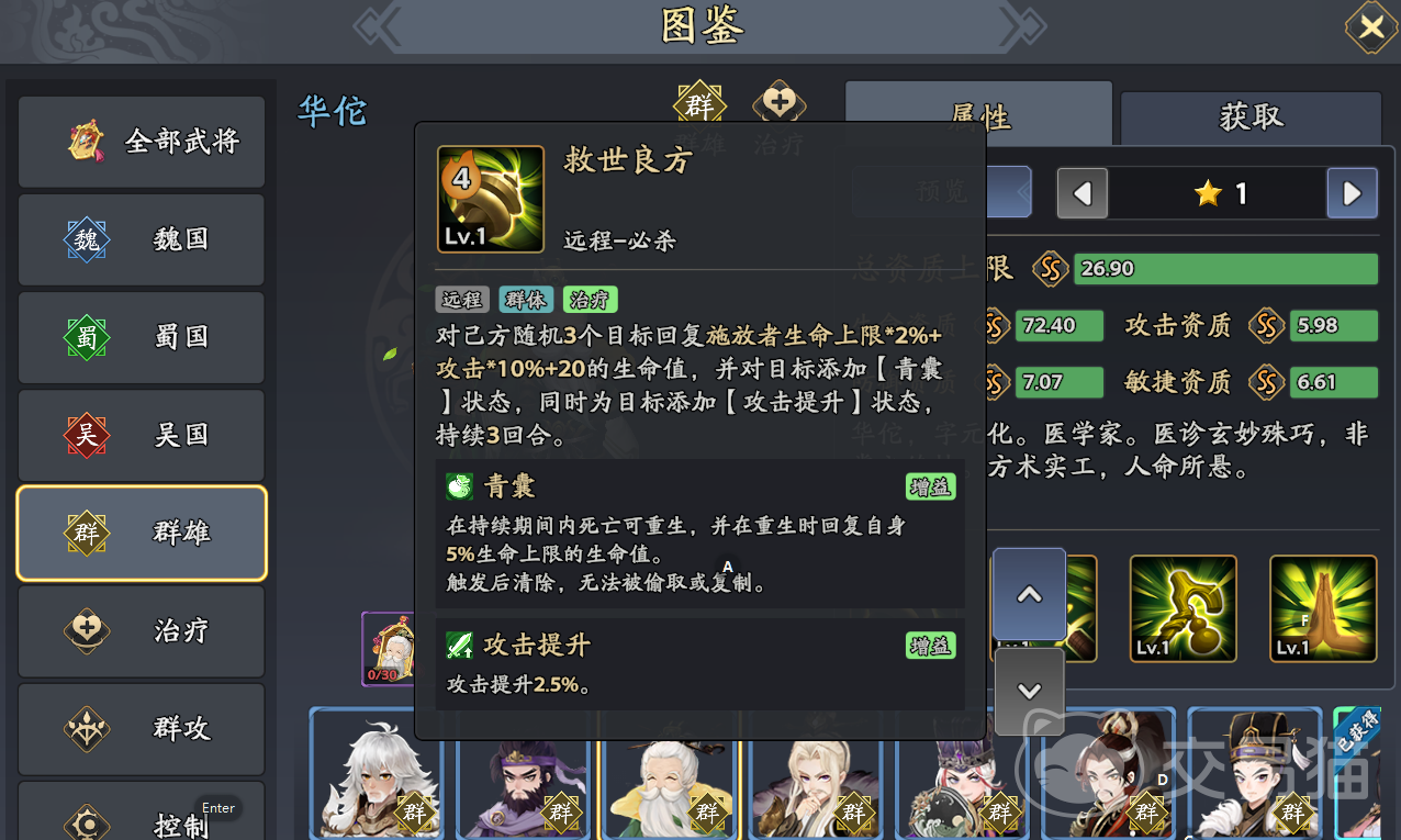 华佗:核心复活奶,【青囊】状态为夏侯惇、吕蒙等提供二次生命,确保前排站场;