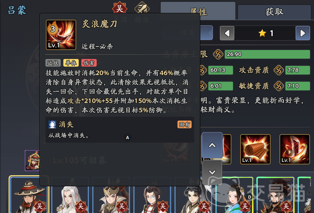 吕蒙:单体收割,【炙浪魔刀】高伤但需消耗20%当前生命,双治疗体系可稳定血线,残血时触发【青囊】复活反打。