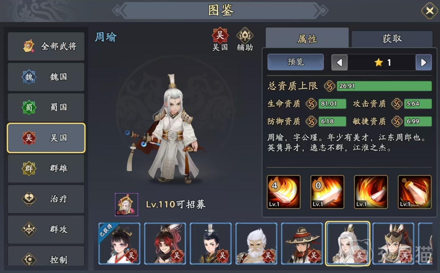 阵容搭配的时候,小编推荐选择小乔、甘宁、黄盖和周瑜作为队友。小乔是吴国阵容中的治疗角色,利用自身的必杀技,能够治疗己方随机三个目标,并且自身获得防御提升状态。主动技能是对单个目标进行回复,还有几率清除目标身上的异常状态。甘宁是属于输出类型,在单体伤害方面非常强势,无论是必杀技还是主动技,都可以打出可观的单体伤害。黄盖的作用自然是在前排吸收伤害,作为防御型的武将,黄盖在战斗回合开始时,就可以直接给己方全体带来援护,自身获得苦肉状态,在此状态下可提升反震概率和效果。