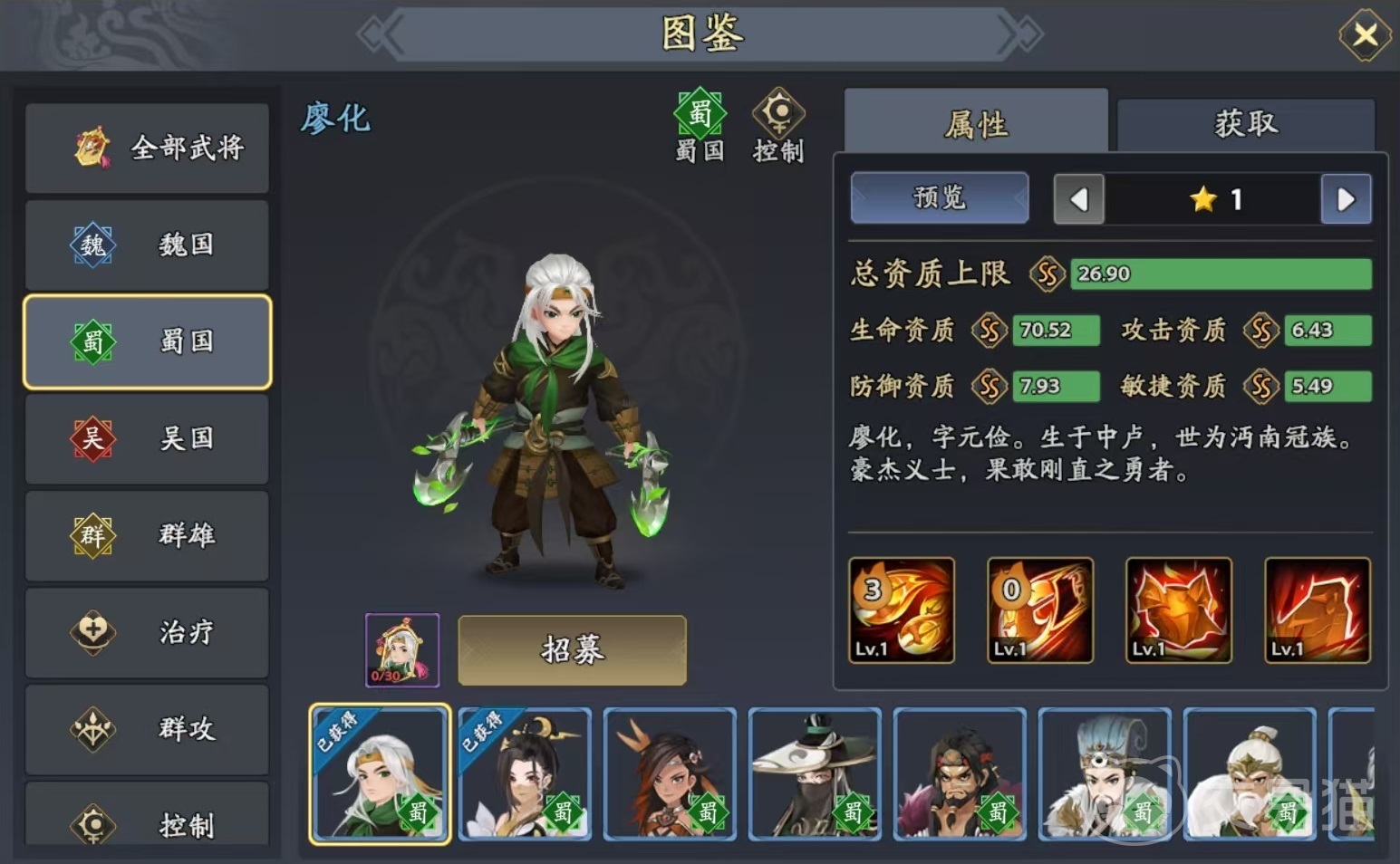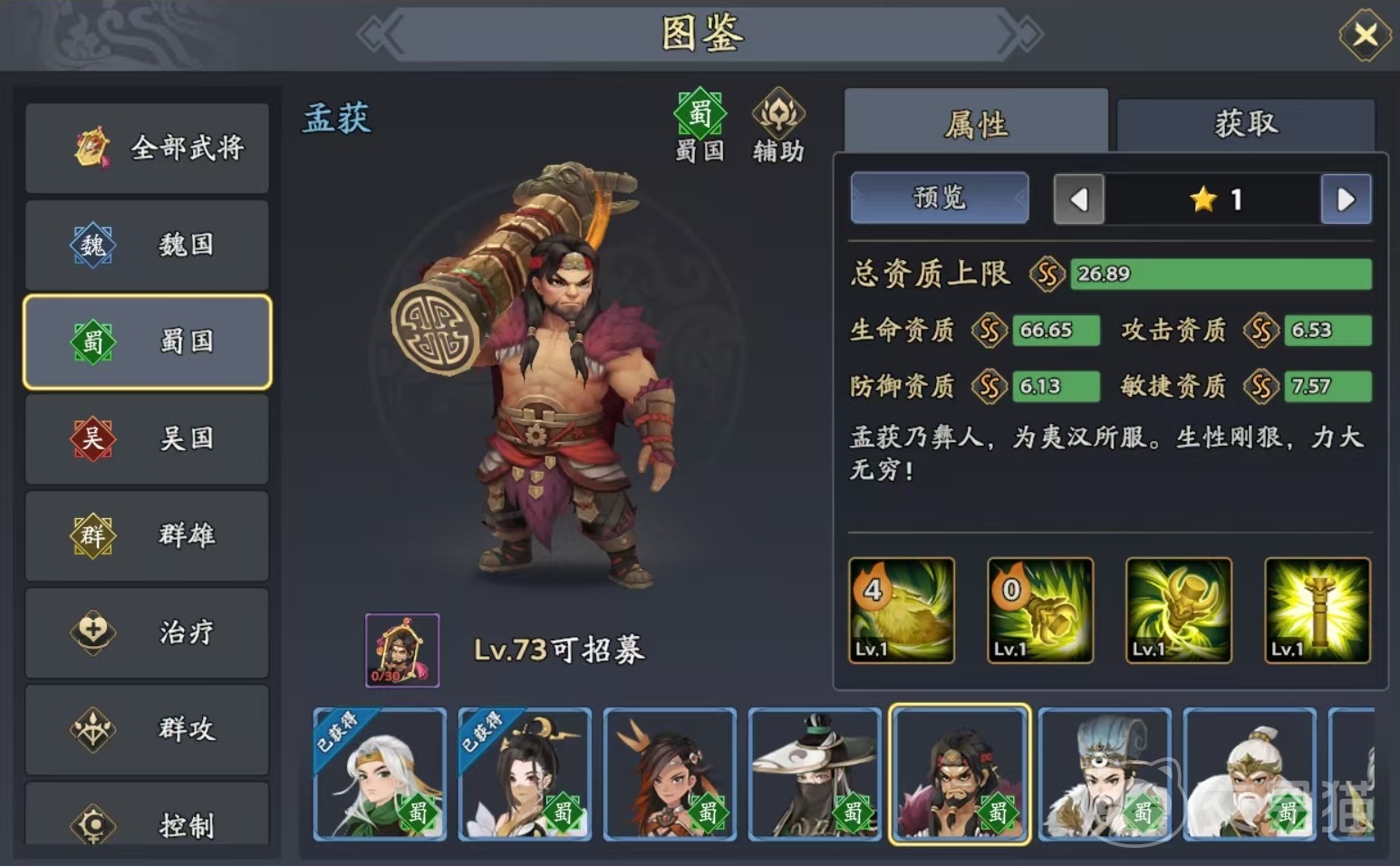 廖化是一个很容易就获取到的武将,但是强度并不低,它的必杀技伤害单体目标,有几率造成混乱状态,对方被混乱之后,普攻将会随机选择目标,很大概率会自相残杀,所以非常有用。孟获是属于辅助类型,自身必杀技能可以给己方目标回复怒气,怒气对于武将来说非常重要,这是孟获的优势所在。其他技能还有添加攻击提升状态等效果,伤害提升更高。