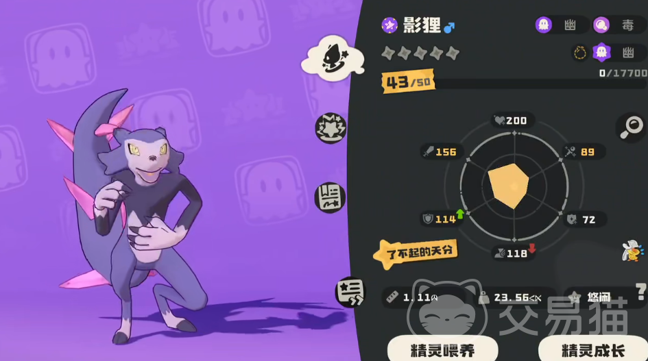 影狸是幽系和毒系的双属性精灵,物攻属性和速度属性突出,它的特性是可以在敌方入场的时候自动赋予敌方3层中毒效果,是非常有效的挂毒利器,因为是毒幽双系的精灵,技能配招自然是从这2个系列里选了。