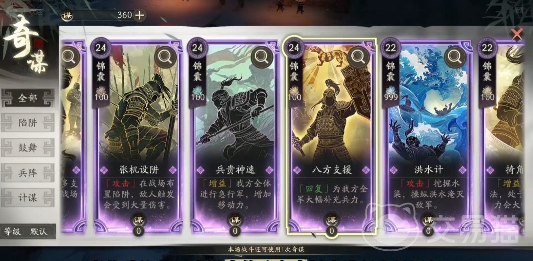 战斗中如果出现血量不佳,可以使用奇谋“八方支援”,给兵士补充血量,如果成功逃脱,则可是使用“全军出击”,迅速解决战斗。