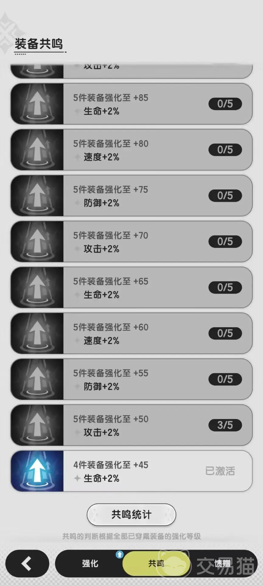 装备系统,这里可以对装备进行强化,装备着重要注意的就是,平均升级,毕竟装备强化有共鸣效果,一般是在4件装备5级,4件装备10级,之后就是15、20、25、30、35、40、45级这样子,这个共鸣效果一定要拿到,不然战力就会莫名缺了不少。