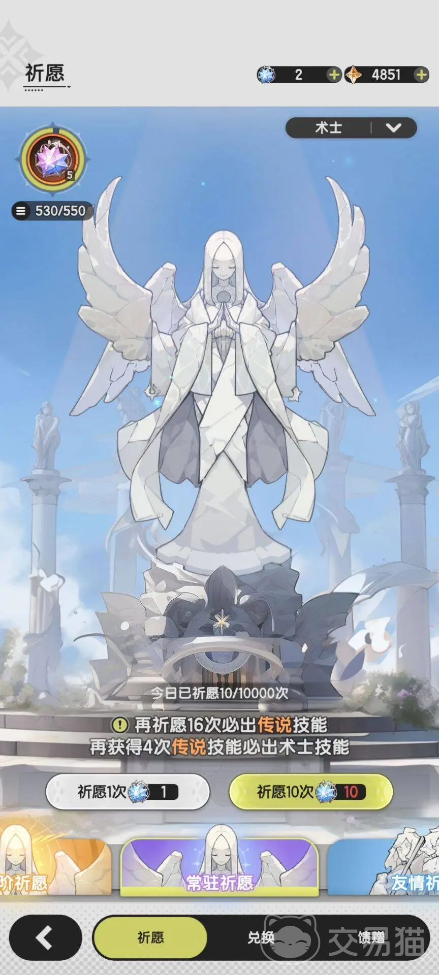 祈愿女神像:抽人物技能,开局官方是给了30抽传说,后续保底就是70抽,建议大家前期打打任务把第一个传说技能抽到。星之愿有10连就直接抽,不要赞,不然战力和进度跟不上的。