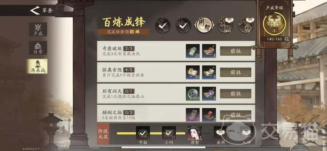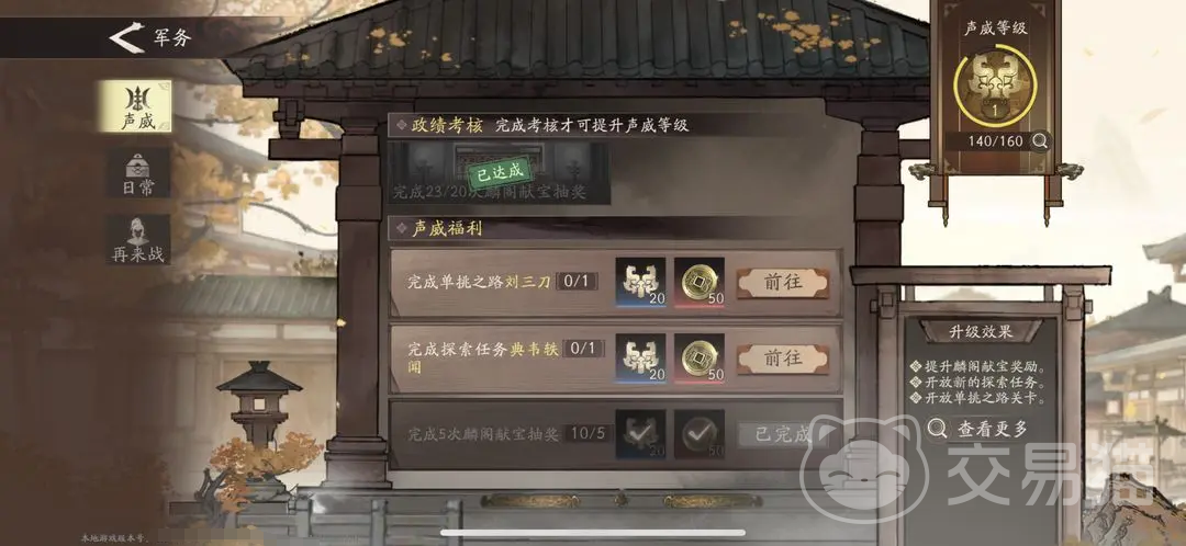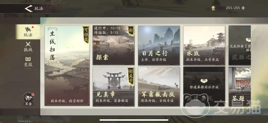 在主线卡主的时候,就可以去将军务中的再来战和日常任务去完成。声威任务也比较不错,声威等级对于副将抽取获得的资源有影响,声威等级越高,抽副将时获得的副将种类越多,可可按照需求提高声威等级再抽。九州奇遇的玩法也建议大家去玩,剪纸风格地图中会有随机事件触发,比如寻访名臣、解谜揽胜等,有不少稀有资源的奖励。