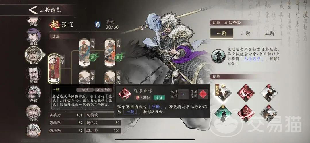 自选池可能就因人而异了,看看大家更加喜欢哪个角色,这边比较推荐张辽,张辽的泛用性很高,作为骑兵,机动性比较强,适合开荒使用,转职之后还有个对于友军的增益技能,非常不错,机动性和输出能力并存。