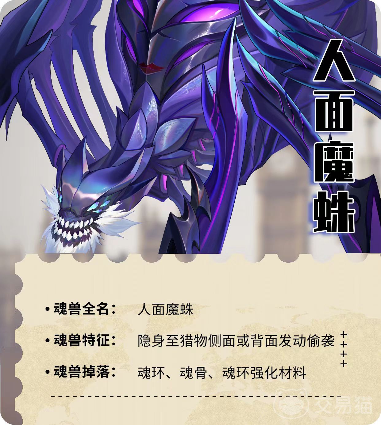 人面魔蛛是游戏中一种极度危险而且邪恶的史诗级别魂兽,它的特征是能够隐身至猎物侧面或者是背面发动袭击,很难防守,可以掉落魂环、魂骨、魂环强化材料等。在外观方面,人面魔蛛呈现鲜明的紫红色,周身散发着毒素,非常危险。