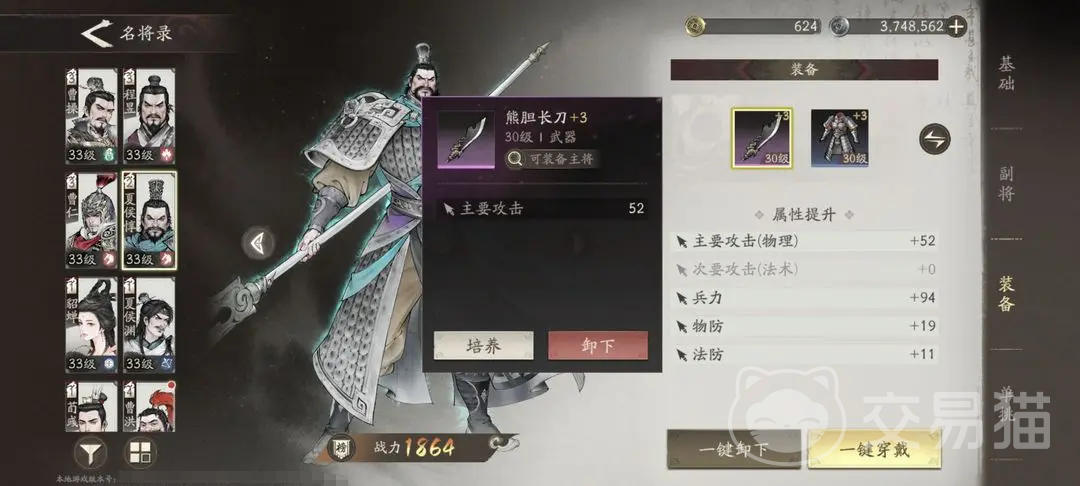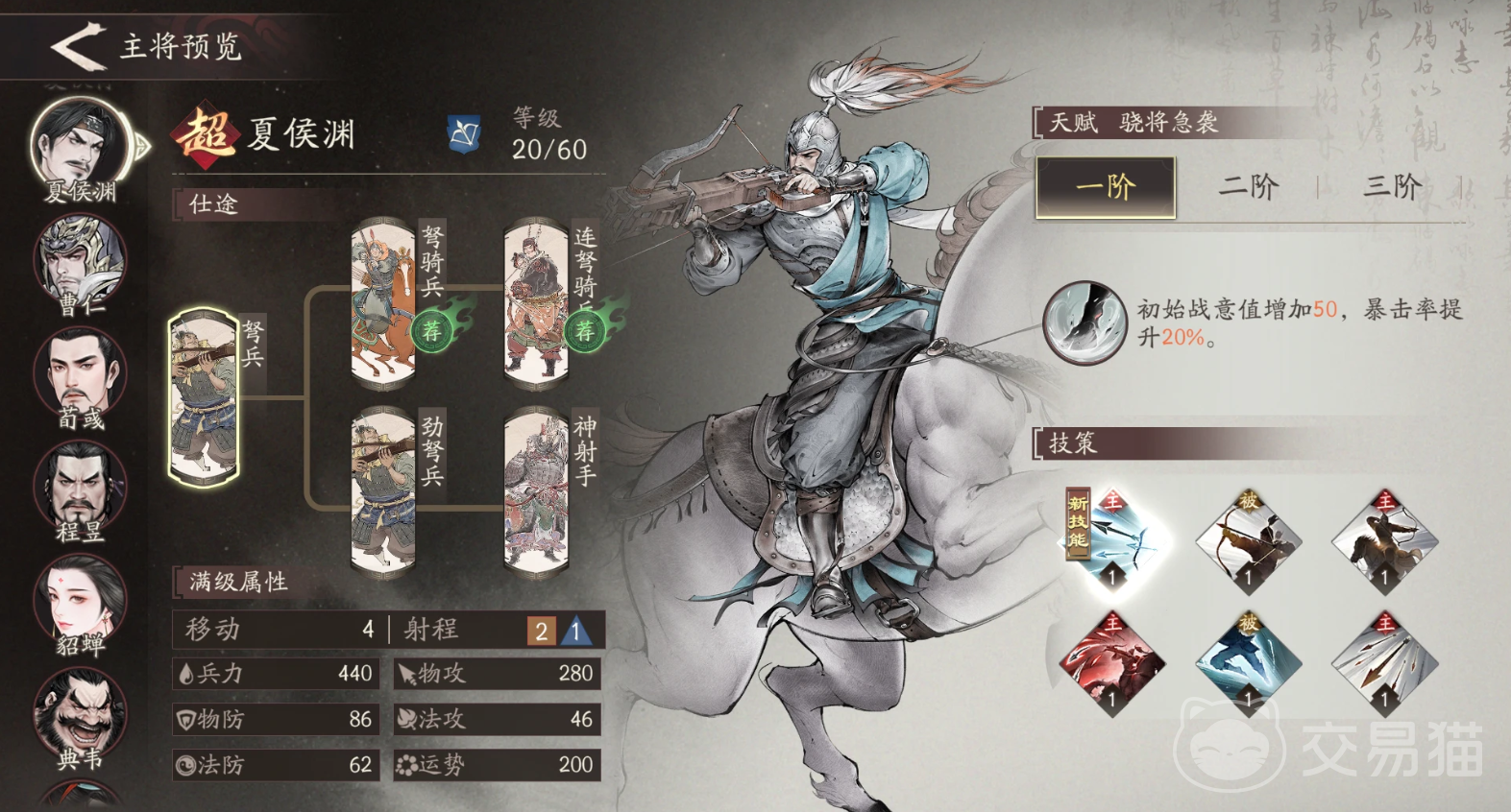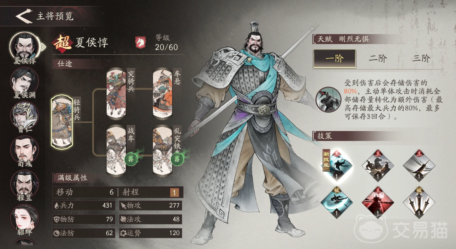 夏侯惇就是初期主线剧情当中直接赠送给大家的“超”品武将,虽然是赠送的武将,但是他的威力是非常的大,人气也很高,是前期非常好用的骑兵之一。有三大核心技能助力他的强度,初始自带的核心单体技“横刀跃马”,攻击单个敌军,造成130%的物攻伤害,在打出伤害之前使目标受到伤害持续2回合增加10%,自己受到的伤害也能持续2回合降低10%。