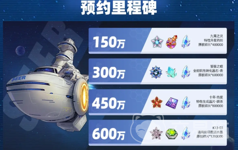 游戏的预约奖励是全网预约人数大多一定阶段后解锁的,达到150万可以获得九霄灵药+特性升星药剂+40万原核碎片,达到300万送饕餮之噬+全能抗性转化晶石-青+60万的原核碎片,达到450万送十年·热爱徽章+特性生成晶片-瞬杀+80万碎片,达到600万送K13-03+通用刻印激活水晶+120万碎片。