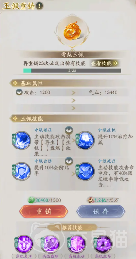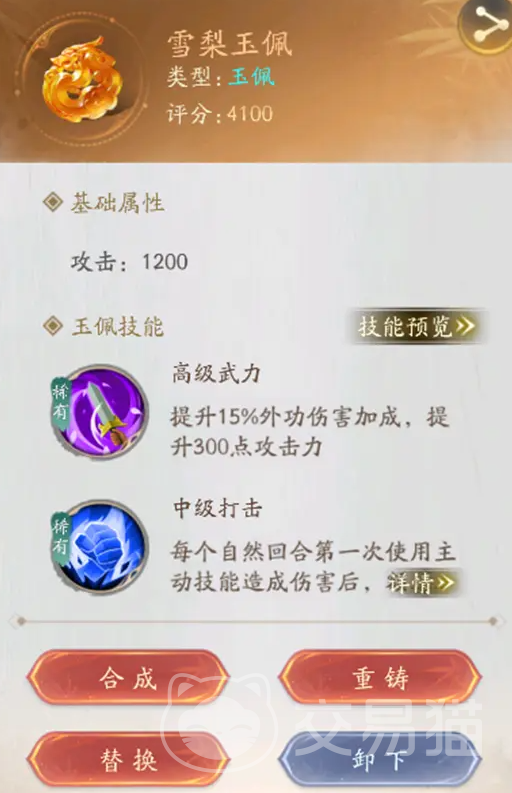 每一次合成大家都能获得一定的玉佩积分,积分达到1000时,能直接领取到一个橙色阶级的,如果合成出来的技能或属性不是自己想要的,就可以利用重铸功能来改变属性和技能,重铸要消耗玉石和铜钱,品质越高的玉佩消耗的也会越多。