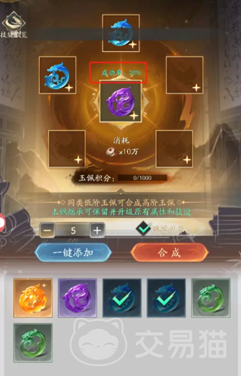 在玉佩的界面可以直接合成或者重铸,玉佩的合成需要2个以上同等级的,2个开始合成会有20%的成功概率,但每增加1个同等级的就能让成功率增加20%,最高用5个可提升到100%,所以脸黑的建议合成时多攒一点。