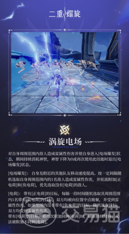 她的主动技能名为漩涡电场,可以进入爆发状态,浑身也会缭绕电流,并持续造成雷属性伤害,是主要输出技能。另外还会附加控制效果,同电荷敌人刷新持续时间,异常电荷则会造成随机伤害。