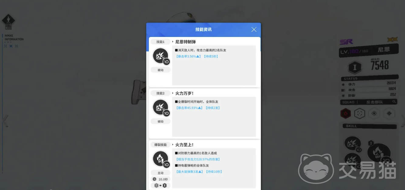 作为一名SR品质的角色,她拥有独特的技能组合,让她可以在战斗中能够发挥巨大的作用。该动技能可以在消灭敌人的同时,帮助队伍中攻击力最强的两位成员提升暴击率,并持续5秒的时间;而火力万岁这一技能,能够让角色在全爆裂时间开始时,让所有队友的暴击率大幅上升45.93%,并持续2发。这些技能显著增强了团队的整体输出能力。火力至上作为尼恩的爆裂技能,在对防御力最强的敌人造成高额伤害的同时,还能增加持有霰弹枪的队友的最大装弹数,提高团队的持续作战能力。