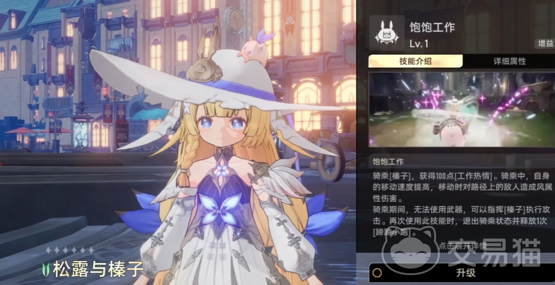 松露的2技能“饱饱够给你做”,乘骑小猪时获得100点的“工作热情”,在乘骑中能有移动速度加成效果,并对路径上的敌方目标造成风属性伤害。因为在乘骑状态下无法使用武器,只能通过小猪“榛子”来进行攻击,再次使用技能会退出乘骑装并释放1次“蹄蹄小跑”。