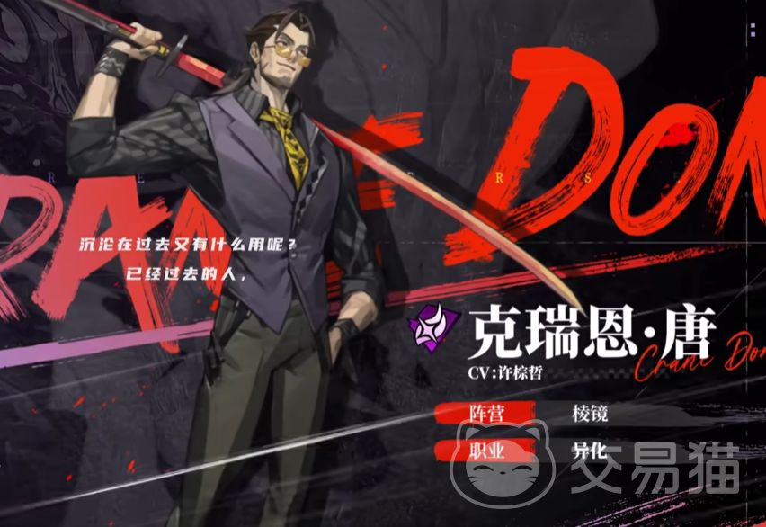 游戏中的盛唐其实名字角做克瑞恩唐,这个角色的造型是一个穿着西服,肩上扛着一把太刀的成熟男人形象,克瑞恩唐看起来似乎对一切都不是那么的在意,没事的时候喜欢吃喝玩乐,可实际上的他却有着无法向他人倾诉的过去。