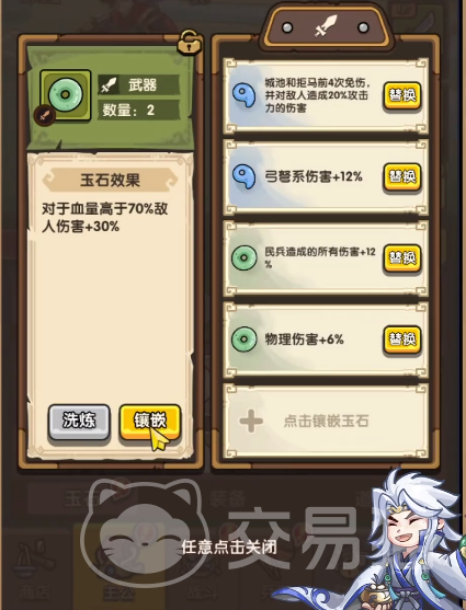 另外在首饰部位也可以选择玉石,有受击减伤玉石,玩家受到攻击之后,不管什么兵种都能减免30%,并且同时还能增加60%的移动速度,可以保障这些兵种的生存,秒杀玉石更是能在对战的过程中,有3%的概率可以直接秒杀对手,这样能快速结束战斗,只不过这个技能对于精英和领主是无效的,可以用这种方法对抗游戏里的一些小兵。