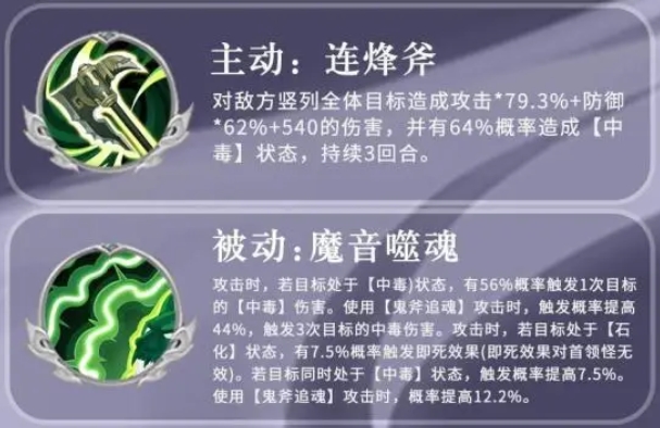 而他的被动技能叫做落影罡风,属于在回合开始时为他披上一层铠甲的防御效果,而有了这个铠甲之后徐晃受到伤害时,更有23.6%的概率将中毒状态反噬给攻击者,相当于是一个反击的效果,然后是主动技能连烽斧,则是徐晃的另一大杀器,对敌方竖列全体目标造成打击的同时,还有64%的概率让敌人陷入中毒的状态中,更为恐怖的是徐晃的被动技能魔音噬魂,当目标处于中毒状态时,他有56%的概率触发一次目标的中毒伤害。