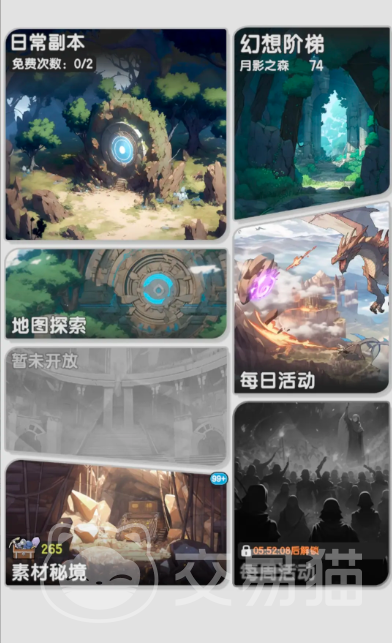 pve玩法除了开荒外,主要就是素材秘境、日常副本、每日活动的圣兽本、每周六会举行的混沌侵袭活动以及幻想阶梯副本,幻想阶梯副本是从森之国后每一个区域都会有的,简单来说就是爬塔,爬塔到一定位阶后可以一键速通。