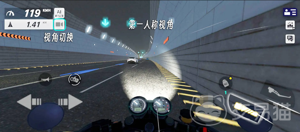 鸣笛有概率让前方的车变道,从而给我们让出位置,此外大家在进入赛道后,也可以点击左上角的摄像头按键,它可以帮助我们切换视角,第一人称视角会带来更加紧张和刺激的破风感,第三人称则有更加开阔的视野,大家可以自由选择。