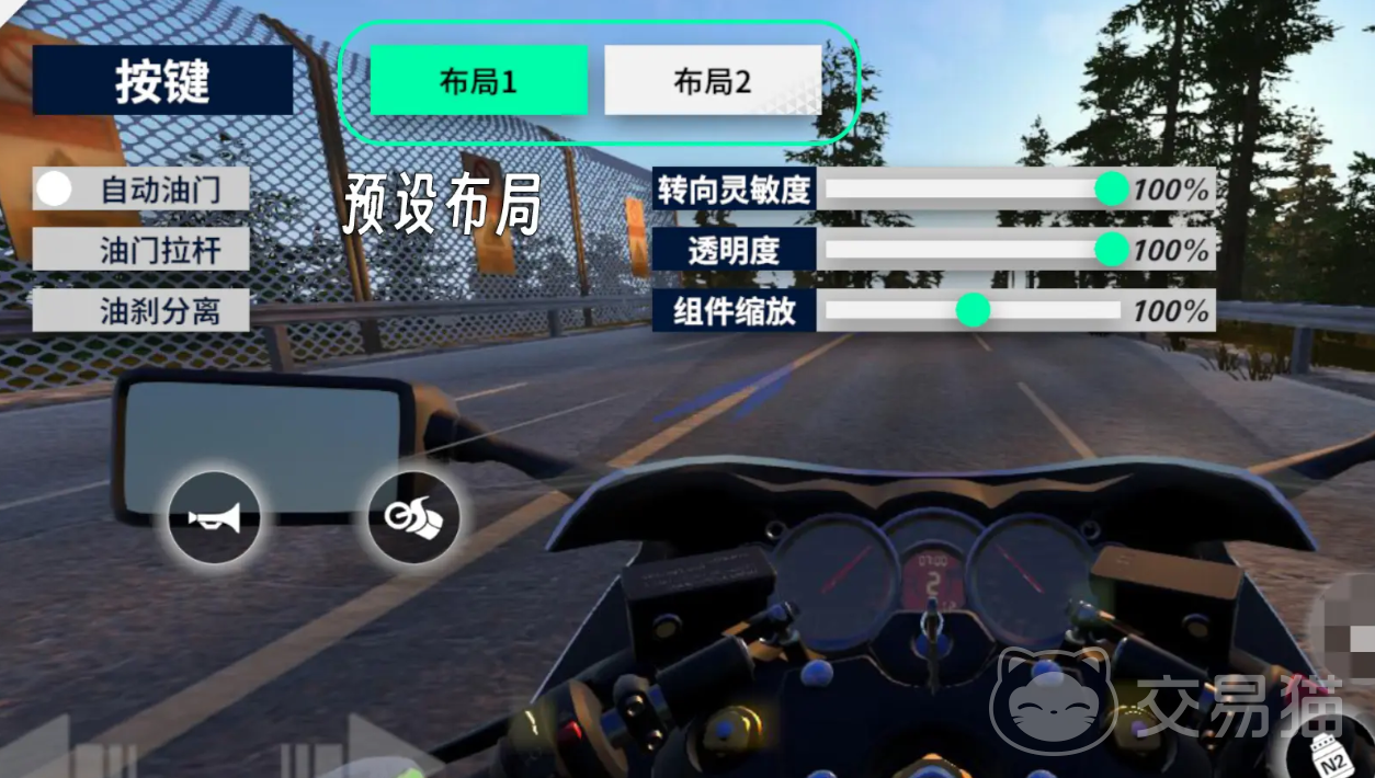 这些基本的操作全部可以自定义按键设置,比方说对操作按键进行拖拽改变位置,挑战转向的灵敏度和透明度等等,如果说希望自己的爱车可以自动加速前进,就可以在进阶模式中选择“自动油门”。