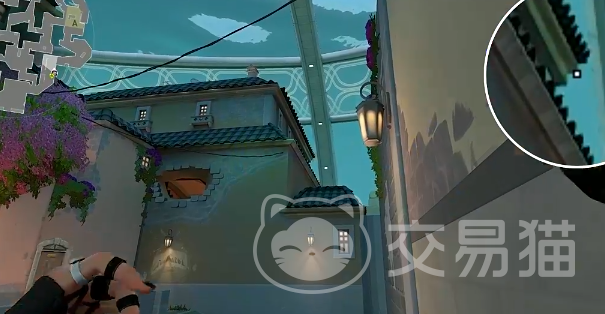 同样的点位,我们若是瞄准下图靠右边的屋檐点位,然后直接投掷,这个眼会落在另外的一个窗口,可以帮助我们照射到A大和A小想要向前压的敌人,往前方稍微走能看到一个箱子,我们在箱子处抬头看,能看到一个残缺的凸起,我们跑步起跳,然后丢出道具诡眼,这样跳投会导致眼落到A包屋顶上面,基本上可以照亮整个包点的所有敌人,看木箱的下面能看到一块布,我们站在布的边边,瞄准左边进行跳投,眼会掉落在屋檐上面,可以找到A小和花店直架的敌人。