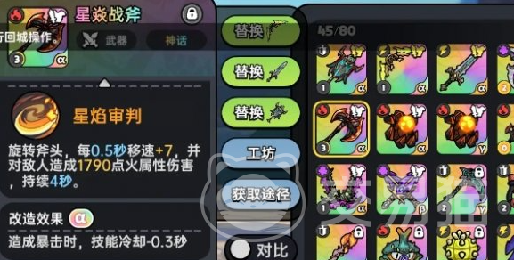 首先要提到的是星焱战斧。这款武器的高爆发能力使其在火属性武器中占据了一席之地。星焱战斧的技能效果是旋转斧头,每0.5秒造成高达1790点的火属性伤害,并持续4秒,同时还可提升角色的移动速度。改造方向上,推荐优先选择α-暴击火斧,因为暴击时技能冷却时间会大幅缩短,这使得玩家能够频繁释放技能,最大化输出。在获得途径上,玩家可以通过小镇深海活动宝箱或击杀小镇石头人后掉落的野猪来获取这把武器。星焱战斧的属性加成也不容忽视,提供的攻击力、暴击伤害和生命值提升,使其在战斗中极具竞争力。