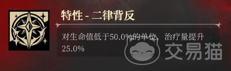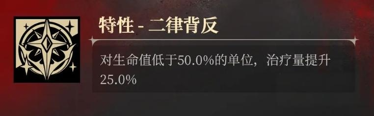 仓凛的特性二律被反时一个单体治疗技能,还技能能够对生命值不超过50%的单体目标来进行治疗,治疗过后,队友的血量可以提升25%。