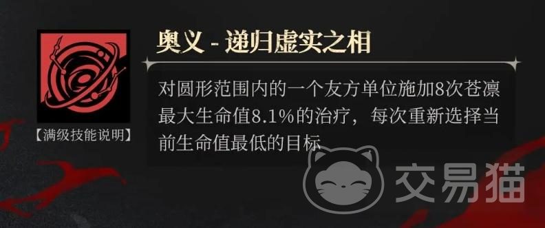 仓凛的奥义递归虚实之向是一个范围治疗技能,使用该技能后在仓凛的周边会出现一个圆形的治疗区域,只要队友在这个治疗区域内都能得到治疗,若是队友在治疗区域内被施加了8次治疗的话,等后续在进行治疗时,该技能都能精准的找到生命值最对的队友。