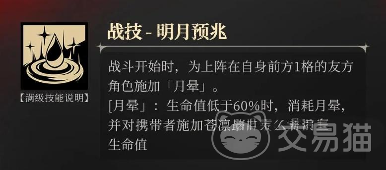 仓凛的战技叫做明月预兆,在战斗开始的时候,仓凛可以给自己前面的队友附加上一层的月晕,当队友的生命值已经低于60%了,月晕就会自动触发,仓凛会对生命值低的队友立刻进行恢复,恢复的生命值是根据仓凛当前最大生命值来进行计算的,最高可达到37%,这个数值在奶妈中可以说奶量是比较高的了。