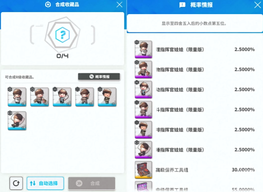 低级蓝色的收藏品,凑齐四个之后,就有2.5%的概率,可以合成限量版的紫色级别收藏品,同理,四个紫色级别的收藏品,也有一定的概率能够合成金色收藏品。