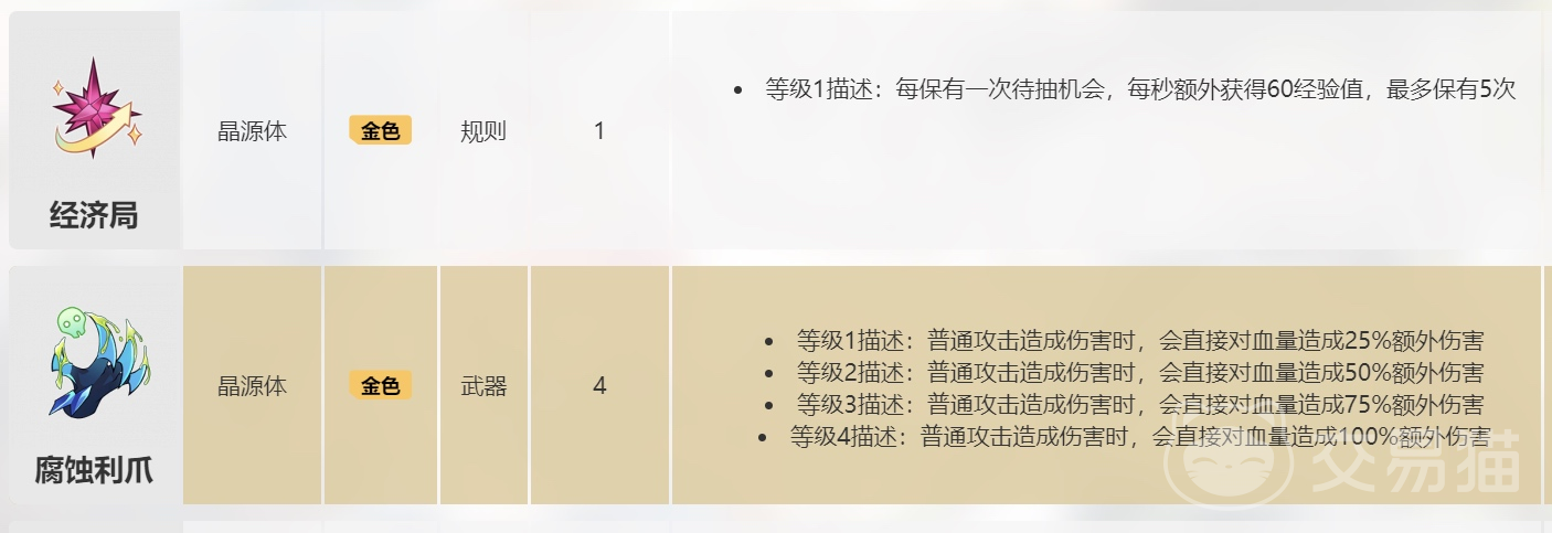 腐蚀利爪也是金色的晶源体型生化卡牌,该卡牌在1级的时候,当普攻攻击造成伤害时,可以给敌人的血量造成25%的额外伤害,卡牌一共能够升到4级,二级时的额外伤害为50%、3级额外伤害为75%、4级的额外伤害为100%。