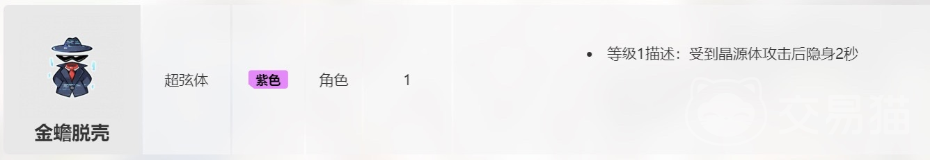 金朝脱壳和沙漏子弹一样,都是超弦体生化卡牌,不过金蝉脱壳卡牌是需要安装到角色身上才能生效的,该卡牌的效果为角色在受到晶源体的攻击以后,可以触发2秒钟的隐身效果。