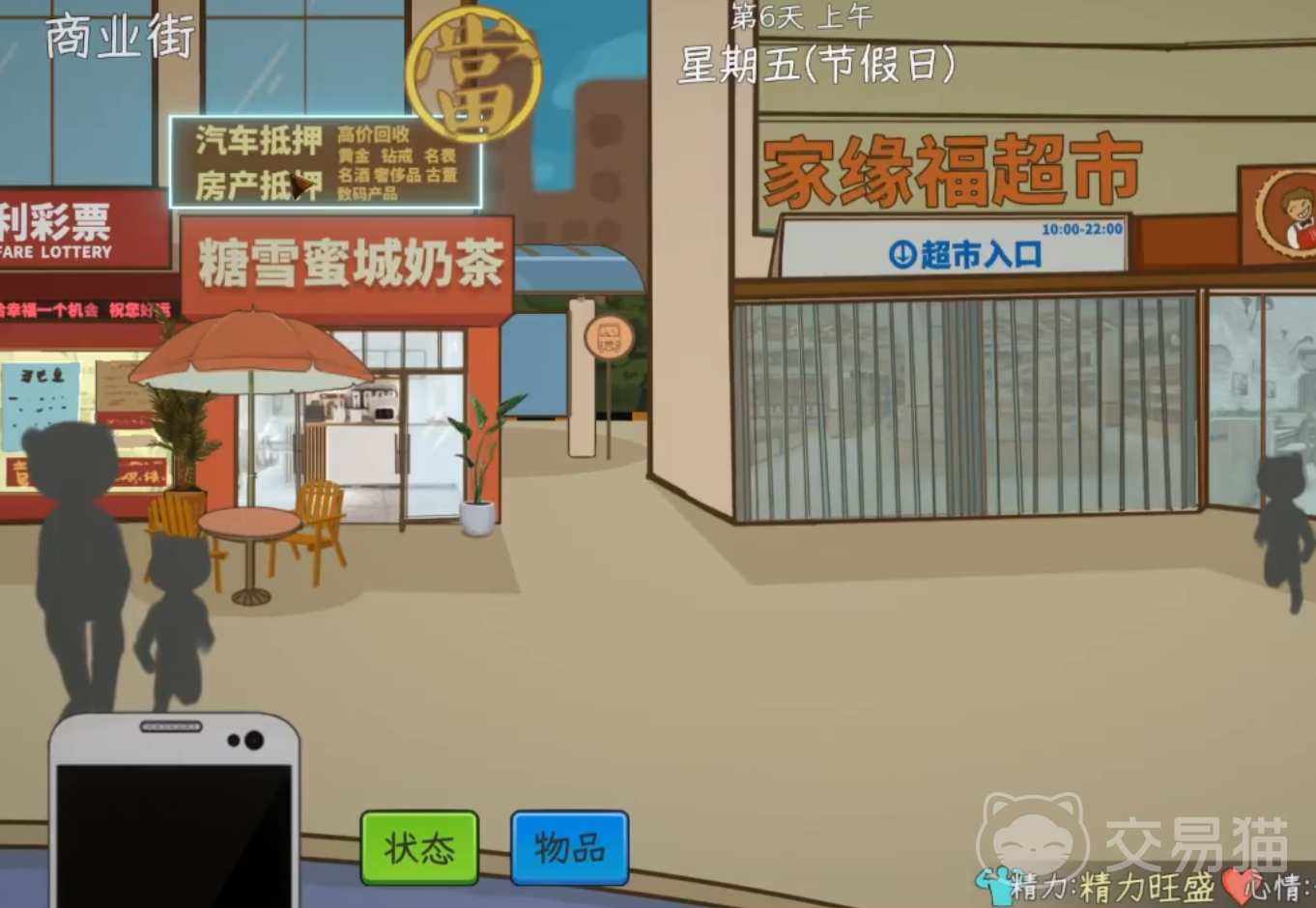 图上牌匾为“汽车抵押、房产抵押”的店铺即典当行,位于商业街奶茶店旁,大家可在此出售各类饰品、装备等道具,点击交互即可进入出售界面。可销售的物品可以打开保险柜(客厅大电视旁边),勾选可取出钻戒首饰、手表、红酒等。