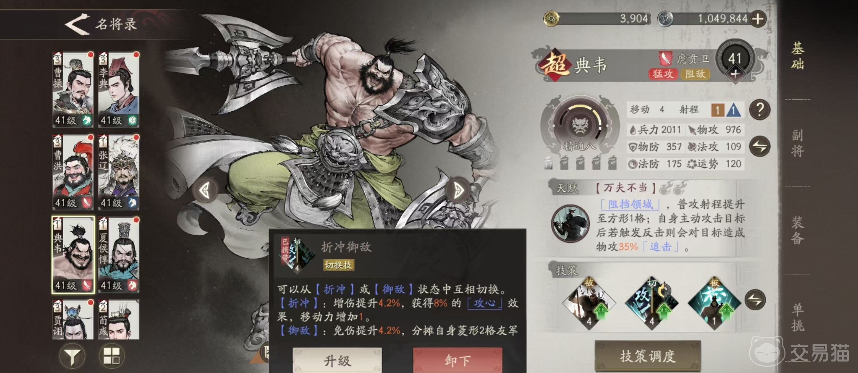 典韦还有一个独特的切换技能,可以在折冲和御敌这两个状态之间互相进行切换。当切换到折冲状态时,伤害提升,有几率获得攻心效果,移动力加1。当切换到御敌状态时,免伤提升,分摊自身菱形两格内友军受到的伤害。这是因为有了这样的效果,所以典韦才会成为队伍中稳定的肉盾输出,通过切换不同形态,带来不一样的效果。在40级之后,可以解锁掉血减伤,给对方减全属性的能力。达到研修一级,可持续到战斗结束。每层都能够带来5%的效果,一共可以叠加三层,也就是最多能削弱对方15%全属性,这样对敌方是非常大的限制。